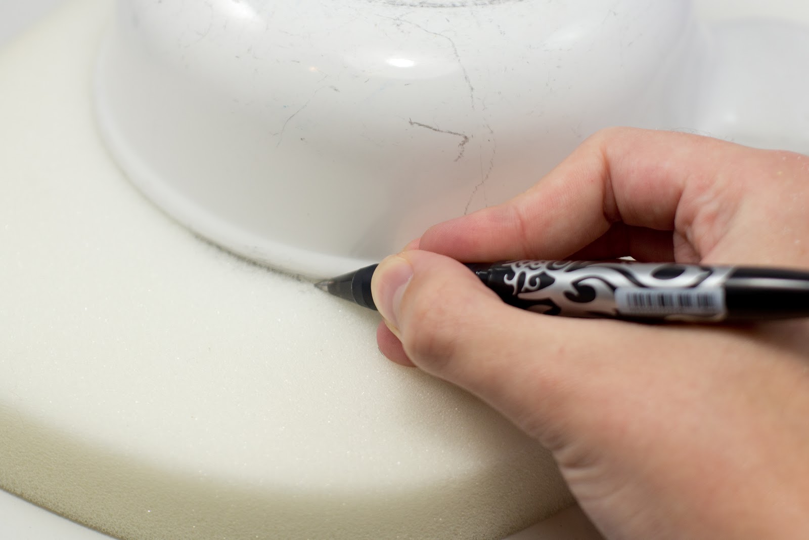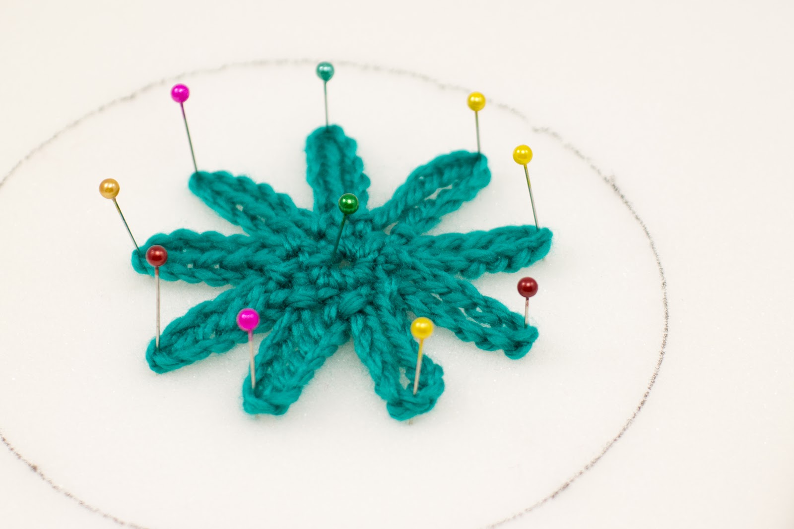 After you’ve finished both flowers, you’ll need to Block them. Start by taking a cup or round bowl and mark a circle on your foam board. Taking your pins, pin down your flowers. Now to block them you can either hover your iron over them and steam them, or spray them with a spray bottle. Steaming usually dries quicker. I found this video very helpful! ~ http://vimeo.com/23758028