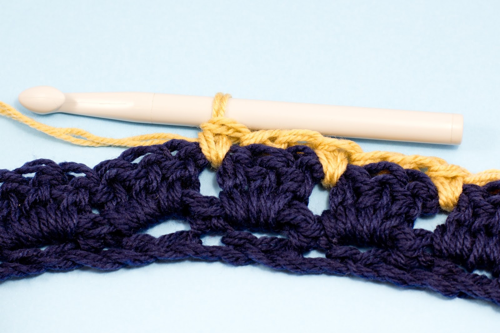 Row 3- Change yarn colour to “Honey”. Ch1, 1 sc in space in between the dc and set of 3 dc made in previous row. *Ch2, 1 sc in between the next 2 sets of 3 dc. Repeat from the * all across. Ch2, 1 sc in turning ch. Turn your work.