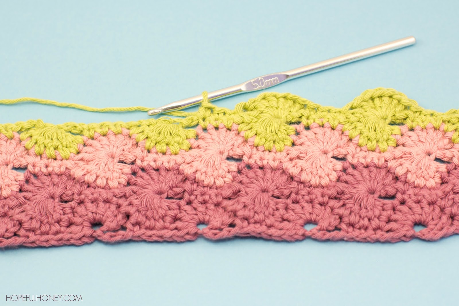 Row 6 – 7~ Change yarn colour to Pistachio. Repeat rows 2 – 3.