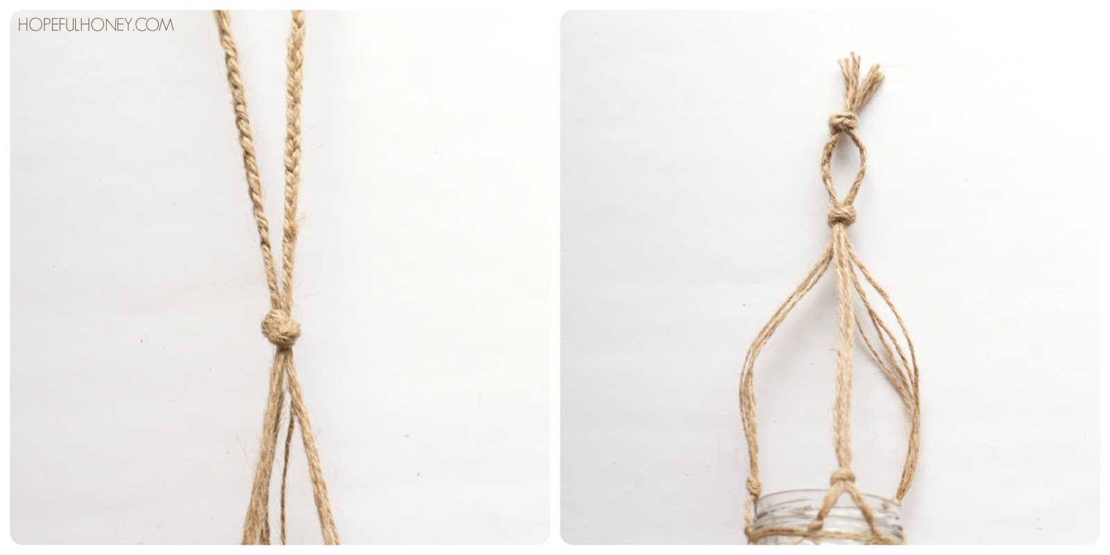 3. Split each knotted group (you made in the previous step) and create new groups of two. Tie these new groups in a knot about one inch away from the previous knot. Repeat this step multiple times, until the net fits perfectly around the jar you chose. Every jar is different, and will require different amount of knotted layers. {Note: You can easily create different designs for your macrame jars by tying the knots on each layer less or more than an inch.}