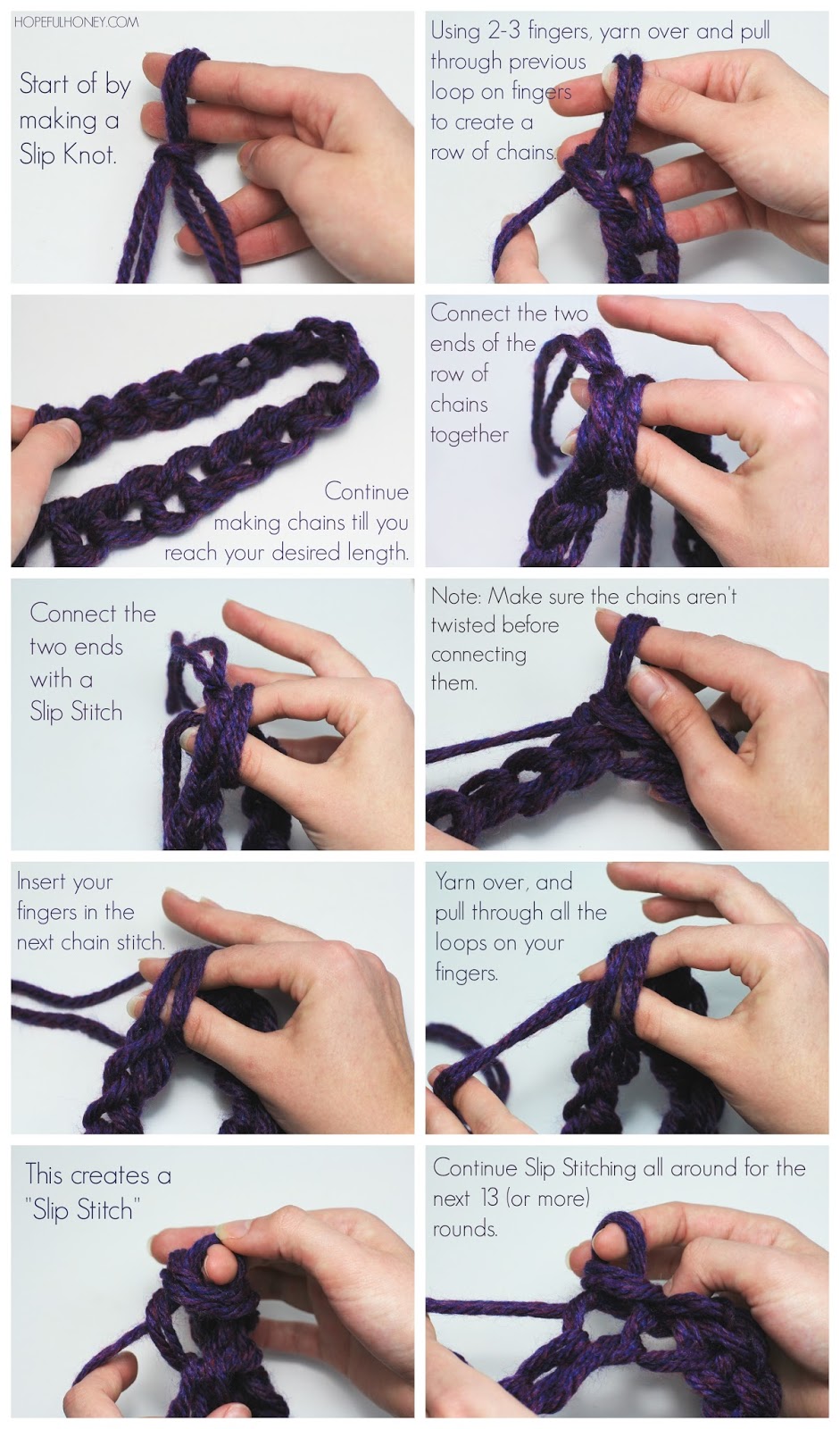 Continue crocheting Slip Stitches all around by inserting your fingers into each chain, yarning over and then pulling back through all the other loops on your fingers.